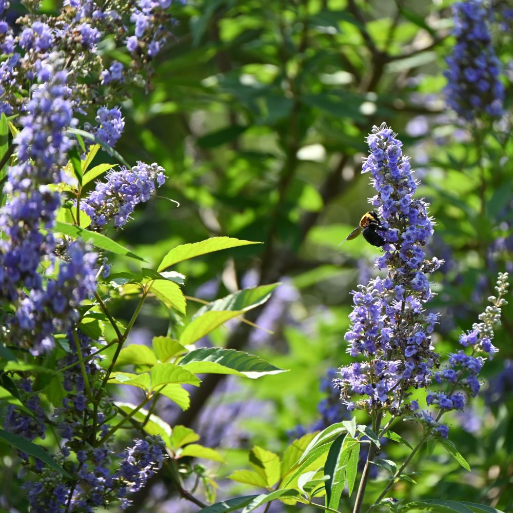 - Vitex agnus-castus ‘Blue Diddley’: Dieser Kleinstrauch passt mit seinen kompakten 1 Meter Höhe und Breite in jeden Garten. Er ist mit blauen, duftenden Blüten von August bis Oktober geschmückt.